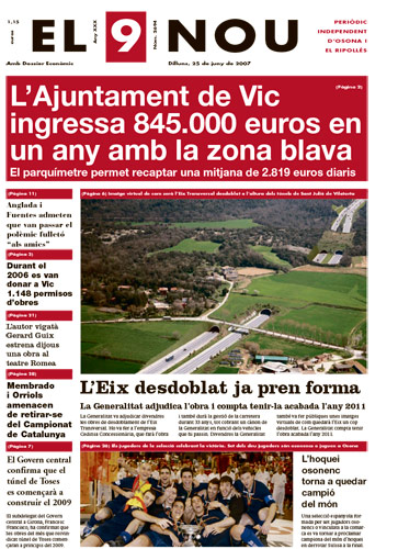 20070625 20070625 | El 9 Nou 25/06/2007 Notícies relacionades LA PREGUNTA Veu bé que el president dels bisbes espanyols opini sobre política? Sí No En aquesta enquesta han votat 143 persones. Vota Les + vistes Set detinguts i una vintena de denúncies en un dispositiu Kanpai contra la multireincidència a Vic i Manlleu La febre per trobar el número de loteria de l'anunci d'un torró ha arribat fins a Tona Fan malbé el ninot de l'escola Joan Maragall de Ripoll La Rosada de Prats de Lluçanès obre portes a una nova manera de viure i envellir al món rural Tres persones intoxicades per monòxid de carboni als Hostalets de Balenyà Girbau celebra un dinar de jubilats a les portes de Nadal Les millors imatges del Mercat Medieval de Vic Osona Ripolles S’encén un cotxe a l’Eix Transversal, a Muntanyola “Portem 22 mesos queixant-nos dels paons i no ens fan cas”