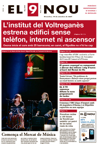20070914 20070914 | El 9 Nou 14/09/2007 Notícies relacionades LA PREGUNTA Està d’acord amb la posició del govern espanyol sobre la guerra a l’Iran? Sí No En aquesta enquesta han votat 564 persones. Vota Les + vistes La N-260 continua tallada fins dilluns "com a mínim" per l'esllavissada a Sant Joan Dues botigues d'un mateix joier pateixen dos atracaments a Vic en menys de quinze dies Condueix sense carnet i té un accident a la carretera de Taradell a Santa Eugènia Dos incendis en uns baixos de Vic en poca estona i a 500 metres de distància Què és aquest color verd del marge del riu Méder? Troben sense vida al Collsacabra un home que estava en recerca des del matí Vic tanca un grup d’I3 a l’escola La Sínia i Manlleu, al Puig-Agut Mor una dona en caure des d'un vuitè pis a Vic Detingut per una agressió sexual a Sant Joan de les Abadesses Alerta pels cabals dels rius Ter a Sant Joan de les Abadesses i Ges a Torelló, que han assolit el llindar de perill