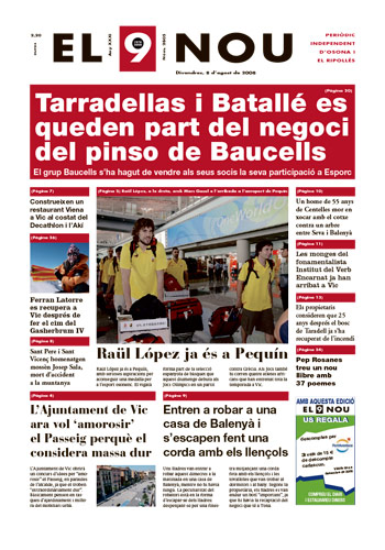 20080808 20080808 | El 9 Nou 08/08/2008 Notícies relacionades LA PREGUNTA Està d’acord amb la posició del govern espanyol sobre la guerra a l’Iran? Sí No En aquesta enquesta han votat 568 persones. Vota Les + vistes La N-260 continua tallada fins dilluns "com a mínim" per l'esllavissada a Sant Joan Dues botigues d'un mateix joier pateixen dos atracaments a Vic en menys de quinze dies Condueix sense carnet i té un accident a la carretera de Taradell a Santa Eugènia Dos incendis en uns baixos de Vic en poca estona i a 500 metres de distància Què és aquest color verd del marge del riu Méder? Troben sense vida al Collsacabra un home que estava en recerca des del matí Vic tanca un grup d’I3 a l’escola La Sínia i Manlleu, al Puig-Agut Mor una dona en caure des d'un vuitè pis a Vic Detingut per una agressió sexual a Sant Joan de les Abadesses Alerta pels cabals dels rius Ter a Sant Joan de les Abadesses i Ges a Torelló, que han assolit el llindar de perill
