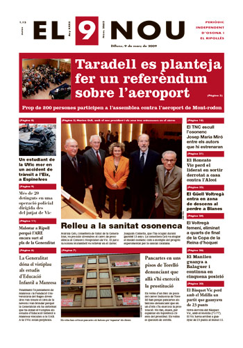 20090309 20090309 | El 9 Nou 09/03/2009 Notícies relacionades LA PREGUNTA Està d’acord amb la posició del govern espanyol sobre la guerra a l’Iran? Sí No En aquesta enquesta han votat 554 persones. Vota Les + vistes La N-260 continua tallada fins dilluns "com a mínim" per l'esllavissada a Sant Joan Dues botigues d'un mateix joier pateixen dos atracaments a Vic en menys de quinze dies Condueix sense carnet i té un accident a la carretera de Taradell a Santa Eugènia Dos incendis en uns baixos de Vic en poca estona i a 500 metres de distància Què és aquest color verd del marge del riu Méder? Troben sense vida al Collsacabra un home que estava en recerca des del matí Vic tanca un grup d’I3 a l’escola La Sínia i Manlleu, al Puig-Agut Mor una dona en caure des d'un vuitè pis a Vic Detingut per una agressió sexual a Sant Joan de les Abadesses Alerta pels cabals dels rius Ter a Sant Joan de les Abadesses i Ges a Torelló, que han assolit el llindar de perill