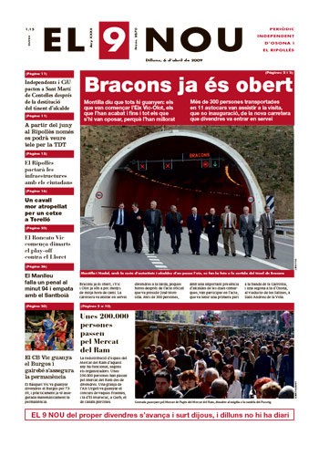 20090406 20090406 | El 9 Nou 06/04/2009 Notícies relacionades LA PREGUNTA Està d’acord amb la posició del govern espanyol sobre la guerra a l’Iran? Sí No En aquesta enquesta han votat 554 persones. Vota Les + vistes La N-260 continua tallada fins dilluns "com a mínim" per l'esllavissada a Sant Joan Dues botigues d'un mateix joier pateixen dos atracaments a Vic en menys de quinze dies Condueix sense carnet i té un accident a la carretera de Taradell a Santa Eugènia Dos incendis en uns baixos de Vic en poca estona i a 500 metres de distància Què és aquest color verd del marge del riu Méder? Troben sense vida al Collsacabra un home que estava en recerca des del matí Vic tanca un grup d’I3 a l’escola La Sínia i Manlleu, al Puig-Agut Mor una dona en caure des d'un vuitè pis a Vic Detingut per una agressió sexual a Sant Joan de les Abadesses Alerta pels cabals dels rius Ter a Sant Joan de les Abadesses i Ges a Torelló, que han assolit el llindar de perill
