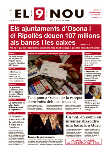 20090409 20090409 | El 9 Nou 09/04/2009 Notícies relacionades LA PREGUNTA Està d’acord amb la posició del govern espanyol sobre la guerra a l’Iran? Sí No En aquesta enquesta han votat 554 persones. Vota Les + vistes La N-260 continua tallada fins dilluns "com a mínim" per l'esllavissada a Sant Joan Dues botigues d'un mateix joier pateixen dos atracaments a Vic en menys de quinze dies Condueix sense carnet i té un accident a la carretera de Taradell a Santa Eugènia Dos incendis en uns baixos de Vic en poca estona i a 500 metres de distància Què és aquest color verd del marge del riu Méder? Troben sense vida al Collsacabra un home que estava en recerca des del matí Vic tanca un grup d’I3 a l’escola La Sínia i Manlleu, al Puig-Agut Mor una dona en caure des d'un vuitè pis a Vic Detingut per una agressió sexual a Sant Joan de les Abadesses Alerta pels cabals dels rius Ter a Sant Joan de les Abadesses i Ges a Torelló, que han assolit el llindar de perill