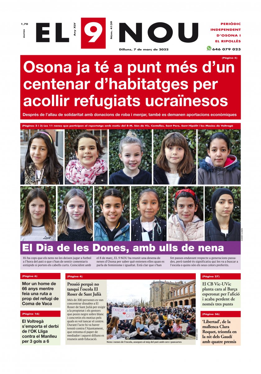 Primera pàgina d’EL 9 NOU del 7 de març del 2022 | Txell Vilamala 07/03/2022 Notícies relacionades LA PREGUNTA Creu que s’està fent bé la gestió de la pesta porcina? Sí No En aquesta enquesta han votat 134 persones. Vota Les + vistes Roda reparteix 1,8 milions d'euros d'un primer premi de la loteria Les millors imatges del Mercat Medieval de Vic Tres persones intoxicades per monòxid de carboni als Hostalets de Balenyà Dos ferits lleus en un xoc frontal a les Masies de Roda Febre pel dècim que surt a l’anunci del torró Més patrulles de Mossos al Remei i al centre de Vic “Portem 22 mesos queixant-nos dels paons i no ens fan cas” Roda reparteix 1,8 milions d'euros d'un primer premi de la loteria La Comissió Europea deixa Osona fora del perímetre de zona infectada per la pesta porcina africana La Guia | Tot el que has de saber del Mercat Medieval de Vic