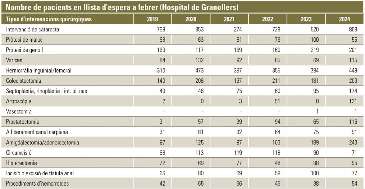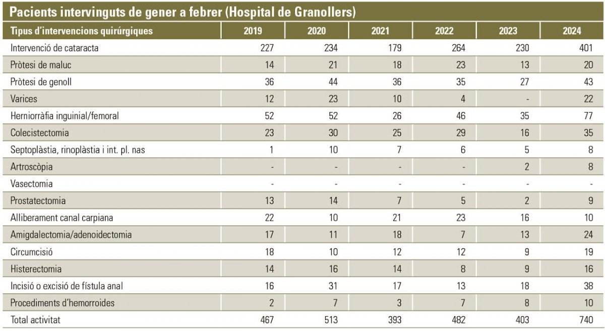 A tot plegat cal sumar-hi la posada en marxa del Centre de Salut Granollers, que va obrir portes el mes de juny passat al carrer Girona. “Haver guanyat aquest espai ens ha permès fer créixer àrees com la d’Oftalmologia, que ara disposa de més quiròfans per fer-hi intervencions de cataractes”, afegeix Bayés. L’operació de cataractes és justament la que més activitat ha guanyat durant el darrer any. Si entre gener i febrer de 2023 es van atendre 230 pacients, durant el mateix període d’enguany se n’han atès 401, gairebé el doble.