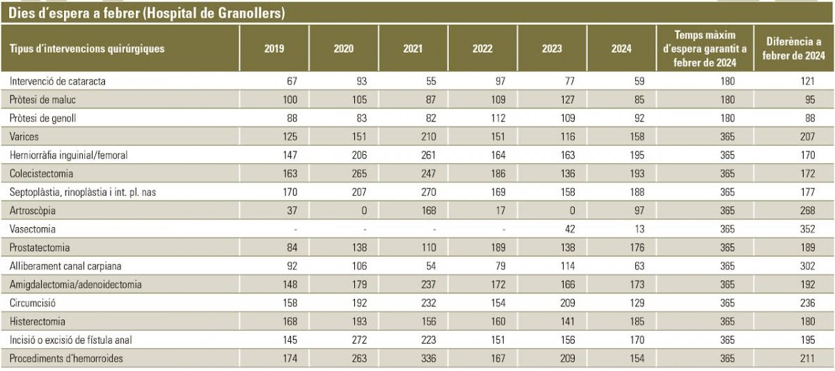 Tal com va publicar aquest periòdic el 12 d’abril passat, 12 d’aquestes 16 operacions han augmentat el temps d’espera des de 2019. Malgrat això, totes les intervencions quirúrgiques que es fan a l’hospital es troben per sota del temps d’espera màxim garantit que fixa el Departament de Salut, que és d’un any en el cas de la majoria d’aquestes actuacions, i de mig any en el cas de les operacions de cataracta, pròtesi de maluc i pròtesi de genoll. “Les proves diagnòstiques han augmentat un 30%. Això vol dir que fem més visites, que equivalen a més diagnòstics i, per tant, a més persones esperant operar-se. Però és important subratllar que tots els procediments es fan dins del temps de garantia”, remarca Bayés.