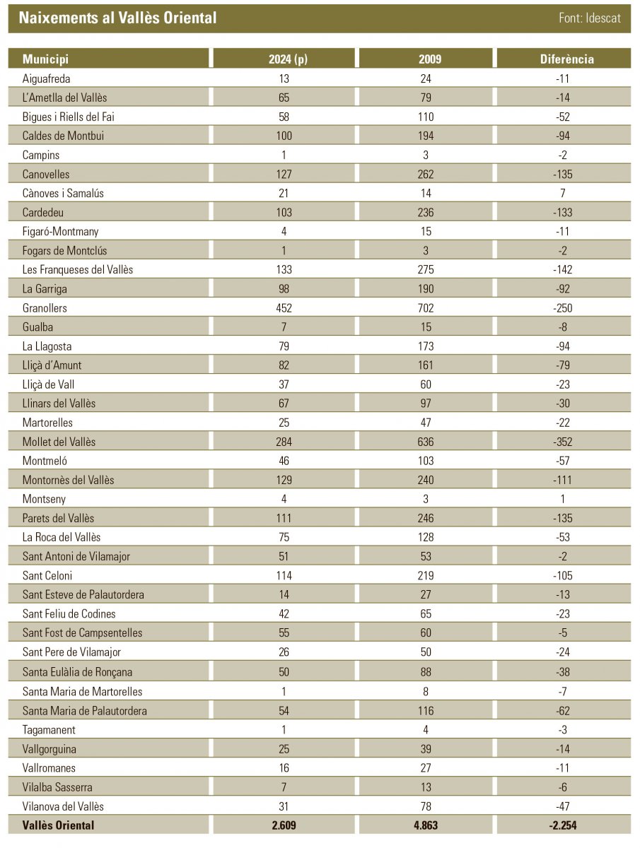 Tret de Cànoves i Samalús i Montseny, tots els municipis del Vallès Oriental han baixat en natalitat respecte fa 15 anys. La majoria ronden una davallada del 50%, la meitat de naixements en comparació amb el 2009. Granollers s’escapa lleugerament d’aquests números, amb una caiguda del 35,6% respecte a aquell any; 250 naixements menys. En canvi, la segona ciutat més poblada de la comarca, Mollet, ha patit una baixada de 352 nadons nascuts en relació amb el mateix període, un 55,3% menys.