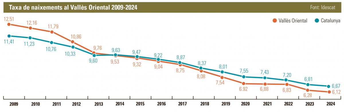 Tret de Cànoves i Samalús i Montseny, tots els municipis del Vallès Oriental han baixat en natalitat respecte fa 15 anys. La majoria ronden una davallada del 50%, la meitat de naixements en comparació amb el 2009. Granollers s’escapa lleugerament d’aquests números, amb una caiguda del 35,6% respecte a aquell any; 250 naixements menys. En canvi, la segona ciutat més poblada de la comarca, Mollet, ha patit una baixada de 352 nadons nascuts en relació amb el mateix període, un 55,3% menys.