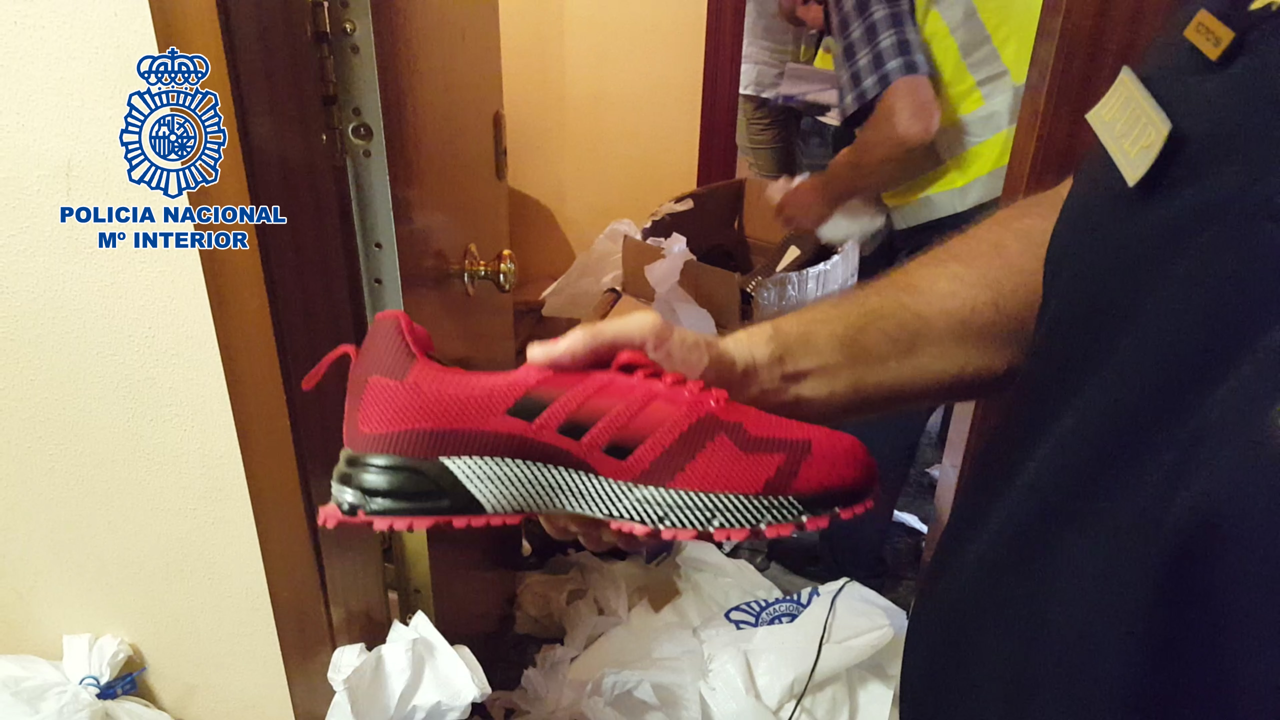 En els registres practicats per la policia estatal, s’han trobat 4.700 peces de vestir i calçat esportiu. També hi havia vinils, centenars d’etiquetes i una planxa per adherir les marques als productes en blanc.