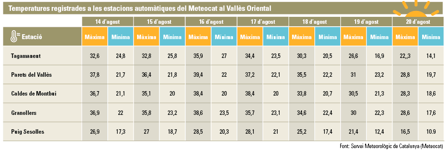 En una nota publicada aquest dijous, el Meteocat va explicar que l’onada de calor d’aquest agost havia estat una de les més llargues i intenses de les que es tenen registres. A les estacions de Granollers, Parets, Caldes i Tagamanent s’hi va superar el llindar de calor intensa durant tres dies; això sí, lluny dels set de Barcelona i les comarques de Girona. Al Puig Sesolles, només va ser un dia. Tot i així, al Vallès Oriental no s’hi han batut rècords de temperatures. De fet, els registres de les estacions de la comarca queden lluny de la màxima catalana, de gairebé 44 graus.