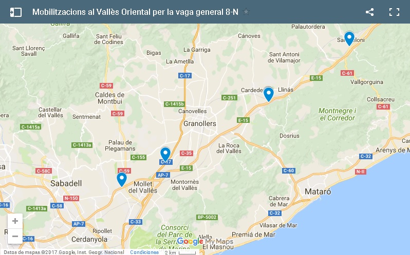 Mapa amb les mobilitzacions al Vallès Oriental per la vaga general del 8-N que està marcada per la reivindicació de llibertat per als vuit consellers del govern empresonats.