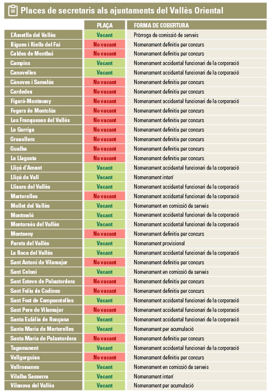 La meitat dels ajuntaments del Vallès Oriental no tenen un secretari fix i han de cobrir les plaça de manera provisional amb personal interí de la Generalitat, funcionaris d’altres àrees del consistori o a través de secretaris que ja tenen plaça a altres poblacions. Segons dades del Departament de Presidència, 19 dels 38 municipis que té el Vallès Oriental es troben actualment amb alguna d’aquestes situacions (vegeu la taula de dalt).