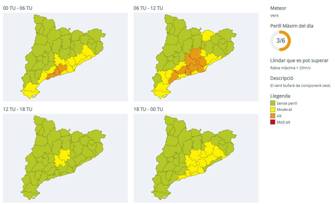 Protecció Civil de la Generalitat alerta que les ventades seran generalitzades dijous a tot Catalunya i se superarà el llindar de vent a la major part del territori, amb més incidència al matí i migdia. El Pla Especial d’Emergències per Risc de Vent a Catalunya (VENTCAT) està en alerta des de dilluns al vespre per la previsió de ventades superiors a 72 km/h aquest dimecres al Vallès Oriental i altres comarques de Tarragona i del litoral i prelitoral de Barcelona.