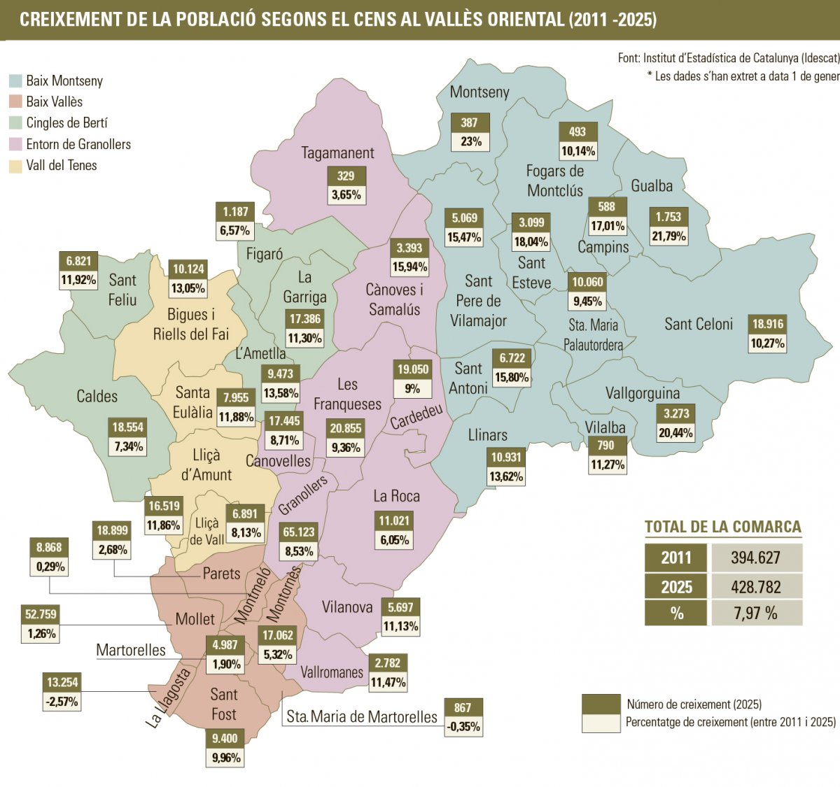 Encara que totes les zones de la comarca han tingut un augment de població, el Baix Vallès (2,21%) i els municipis de l’entorn de Granollers (8,69%) són els que ho han fet en menys mesura. La Llagosta i Santa Maria de Martorelles en negatiu i Martorelles, Mollet i Montmeló no arriben a un creixement del 2%. No obstant això, és una zona de la comarca que agrupa gran part de la població (126.096 habitants), igual que ho fan els municipis de l’entorn de Granollers (142.302 habitants), que en aquest cas sí que assoleixen un creixement superior al 2% des de 2011.