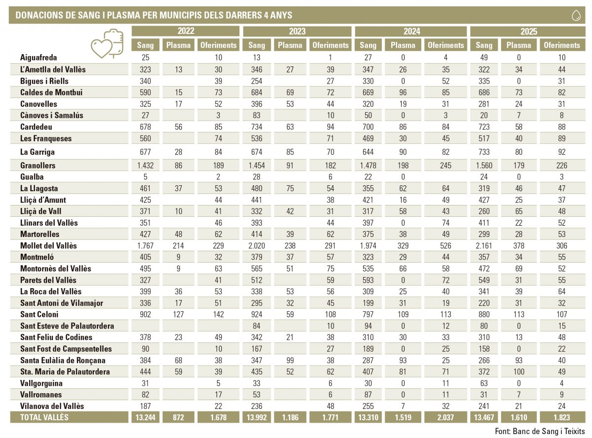 El volum màxim de donacions de sang dels darrers anys, 13.992, es va assolir el 2023, però l’any següent es va produir una baixada fins a les 13.310. El 2025, tot i una lleugera recuperació, es va tancar amb 13.467 donacions, encara per sota del pic del 2023.