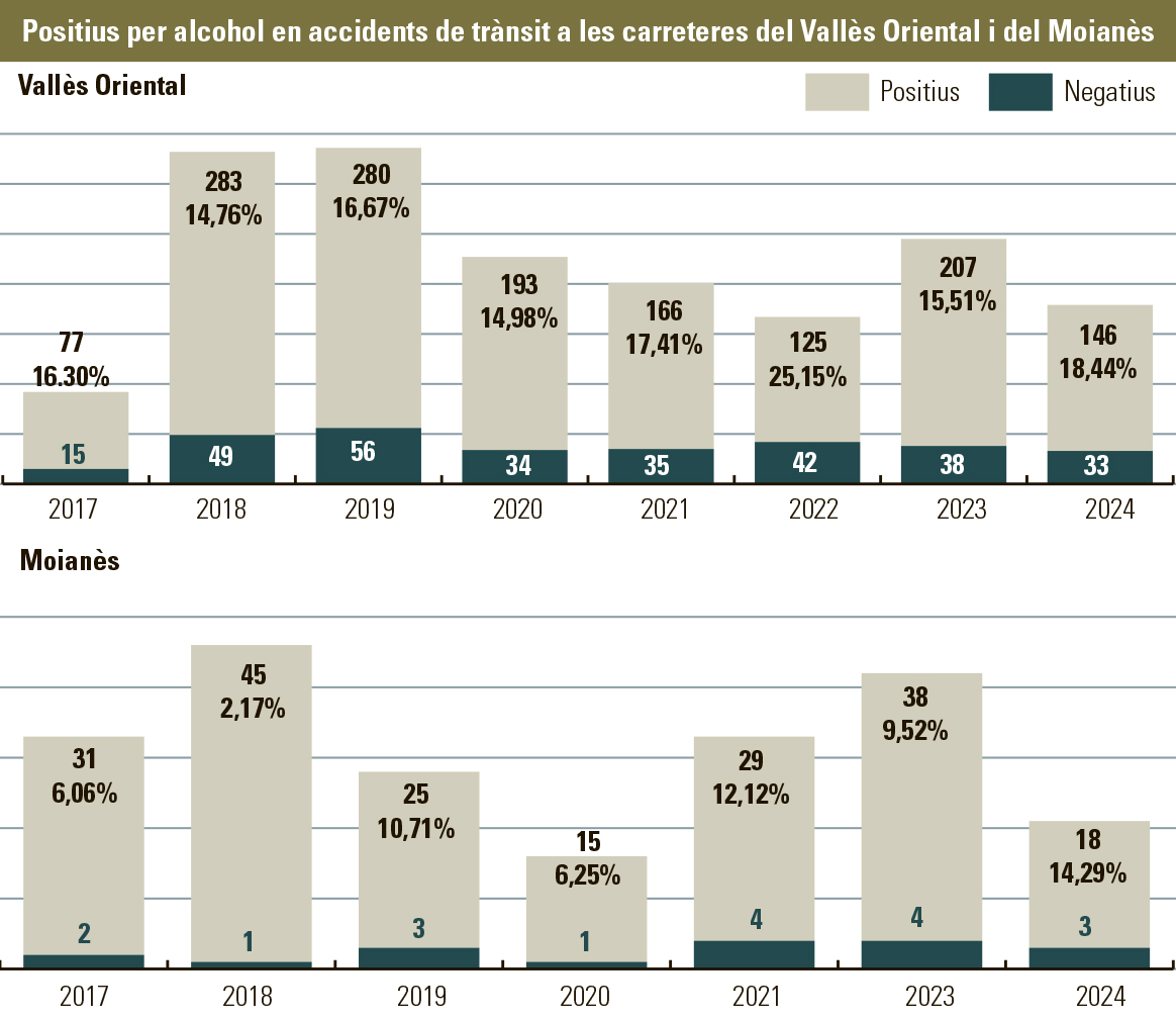 En el cas del Moianès, hi ha més volatilitat en els percentatges perquè el total d’accidents on es fan proves d’alcoholèmia és més reduït. En aquests 11 mesos de 2024, s’han detectat tres positius en 21 accidents, el 14,29% del total. Respecte a l’any 2023, puja perquè hi va haver el 9,52% de positius, 4 entre 38 sinistres.