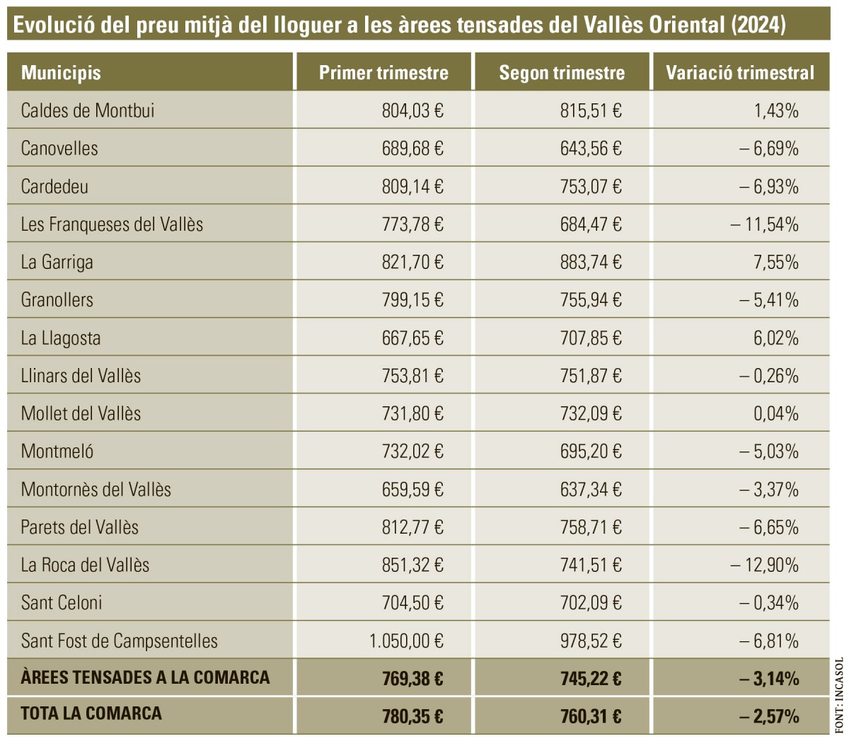 Pel que fa al global de la comarca, on a la majoria de municipis encara no s’havia aplicat la zona tensada, el lloguer va patir una davallada del 2,57% durant el mateix període.