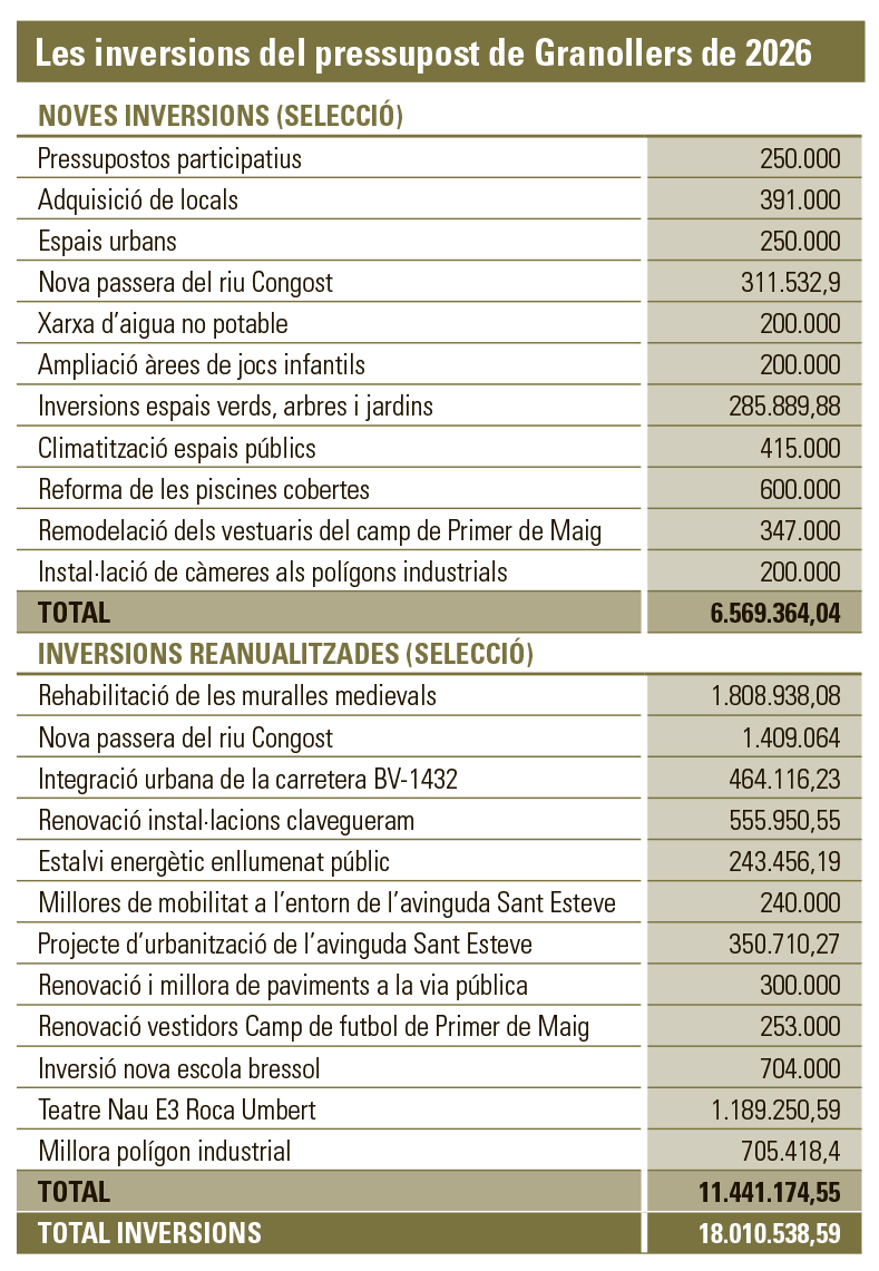 El govern del PSC a l’Ajuntament de Granollers portarà al ple un pressupost per al 2026 amb 18 milions destinats a inversions. D’aquests, 6,57 milions corresponen a noves inversions i la resta –11,4 milions– són accions ja pressupostades al 2025 que es mantenen per al 2026 perquè o no s’han acabat d’executar o encara no han començat. En aquest grup, hi ha les actuacions amb major inversió: la rehabilitació de les muralles medievals (1,8 milions), el nou teatre a Roca Umbert (1,18), la nova passera sobre el Congost (1,4) o la quarta escola bressol (704.000 euros). D’entre les noves partides, la més gran són els 600.000 euros que es destinaran a l’acabament de les obres de reforma de les instal·lacions de les piscines municipals i que sumaran al projecte la rehabilitació de vestidors que no s’havia previst inicialment.