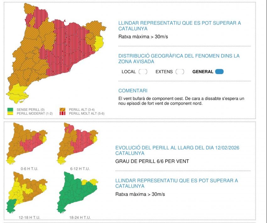 Segons ha dit Segalà, l’episodi tindrà dos màxims, el primer serà aquest dijous amb el vent que arribarà a totes les comarques de Catalunya “sense excepció” i el segon serà dissabte. Les ratxes de vent que han començat aquest dimecres han arribat als 140 km/h en zones com el Vallès Oriental o 115km/h. Ja s’ha emès avisos de perill de graus 5 i 6 perquè s’esperen ratxes de més de 90 i 100 km/h durant l’episodi. La ventada, ha remarcat, afectarà tot Catalunya amb més o menys mesura.