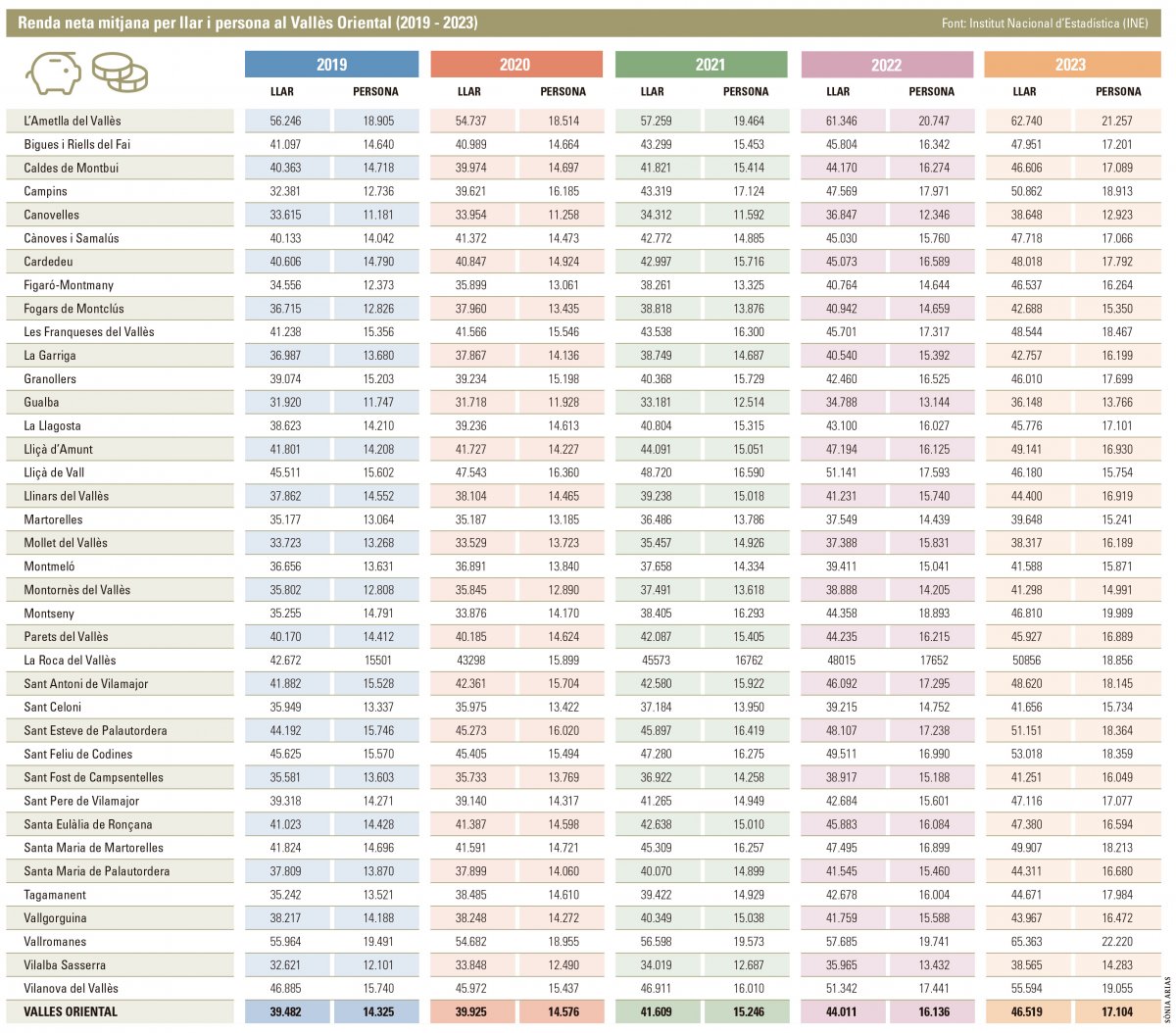 Des de l’any 2019, la renda neta per persona al Vallès Oriental ha anat pujant progressivament. Les dades de 2023 mostren un creixement del 19,65% respecte a les indicades abans de la pandèmia de la covid-19. No obstant això, la diferència entre l’ingrés més elevat i el més baix és de 9.297 euros. Segons les dades publicades per l’Institut Nacional d’Estadística (INE), la renda neta mitjana per persona a la comarca el 2023 va ser de 17.104 euros i el 2019 era de 14.325 euros. Comparant el creixement amb les dades de Catalunya, el Vallès Oriental ha crescut 3,11 punts percentuals més. La mitjana catalana és de 16.461 euros el 2023, amb un augment del 16,54% des de 2019. A més, hi ha 25 dels 38 municipis que superen la mitjana catalana.