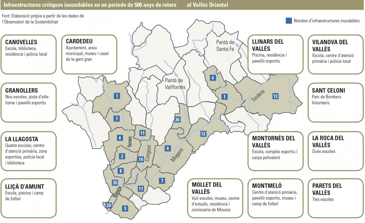 Al Vallès Oriental, hi ha 193 infraestructures vulnerables en cas d’inundació tenint en compte el creixement màxim dels rius calculat en un període de 500 anys. Del total, una trentena són centres educatius i s’hi sumen tres centres d’atenció primària (CAP) i 28 equipaments municipals com biblioteques, museus o zones esportives. La delimitació de les zones inundables associades als 500 anys de retorn tenen a veure amb els esdeveniments extrems i les àrees que es poden inundar dins aquest període de temps.