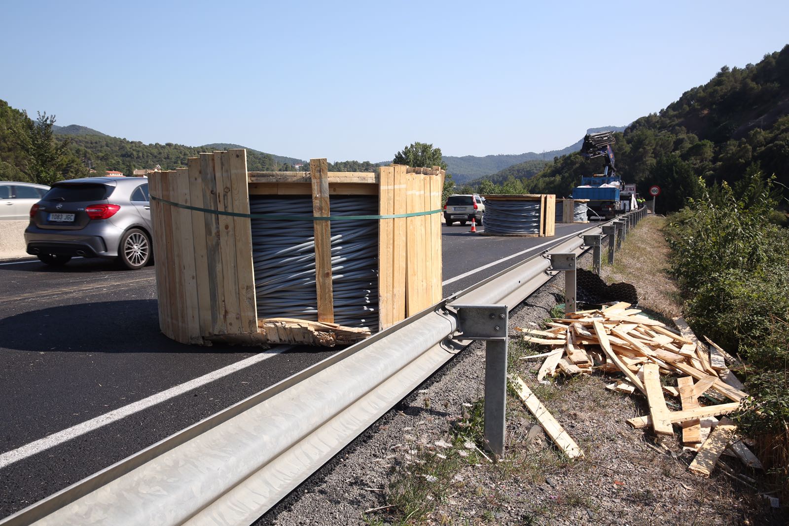 Un camió que transportava bobines de fusta ha perdut la càrrega aquest divendres a primera hora de la tarda a la C-17 a l’altura d’Aiguafreda. L’incident ha passat cap a 3/4 de 4 de la tarda a l’altura del quilòmetre 42 a la calçada en sentit sud.