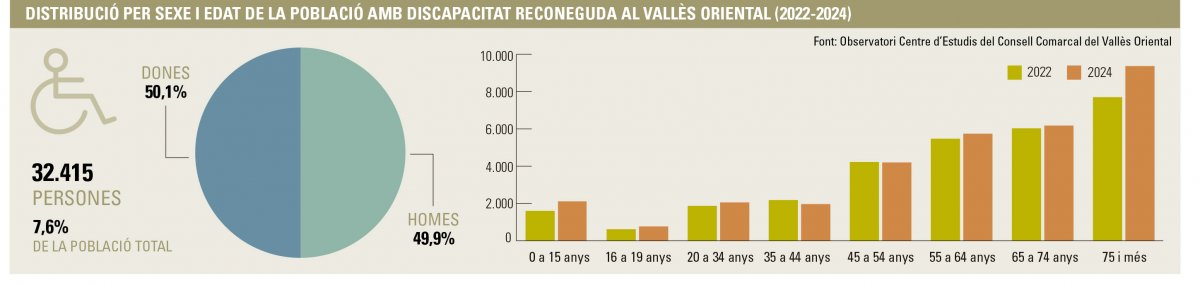 A la comarca hi ha 32.415 persones amb discapacitat reconeguda, és a dir, que han rebut un certificat legal que indica que tenen un grau de discapacitat del 33% o més. Són 16.178 homes i 16.237 dones, una distribució de gairebé el 50% per sexes, i suposen el 7,6% del conjunt de la població del Vallès Oriental. Aquesta proporció es troba lleugerament per sota de la de Catalunya, que se situa en el 9%. El darrer informe de l’Observatori Centre d’Estudis del Consell Comarcal del Vallès Oriental actualitza aquestes xifres, de l’any 2024, i indica un creixement del 9% a la comarca en dos anys, 2.684 persones més que el 2022. En el mateix període de temps, el conjunt de la població vallesana va créixer el 2,3%.
