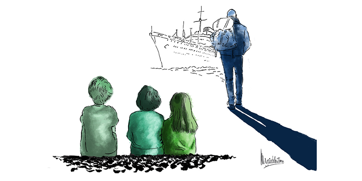 En anar-lo a rebre, tots teníem el mateix pensament: com sabrem que és ell? Algú portava fotografies per fer més fàcil la trobada. No van caldre. Mentre el vaixell feia les maniobres per atracar, la coberta ja era plena de viatgers que buscaven els seus parents, movent les mans enlaire. Jo el vaig veure de seguida. Segur que era ell, tenia el posat de l’avi. “Mireu allí, a la dreta, el de l’americana blau marí”. Una vegada a terra ens hi vam atansar tots: els tres germans al davant. Gairebé no sabíem què dir. Quan ens vam abraçar amb aquell silenci tens, vaig estar a punt de plorar.
