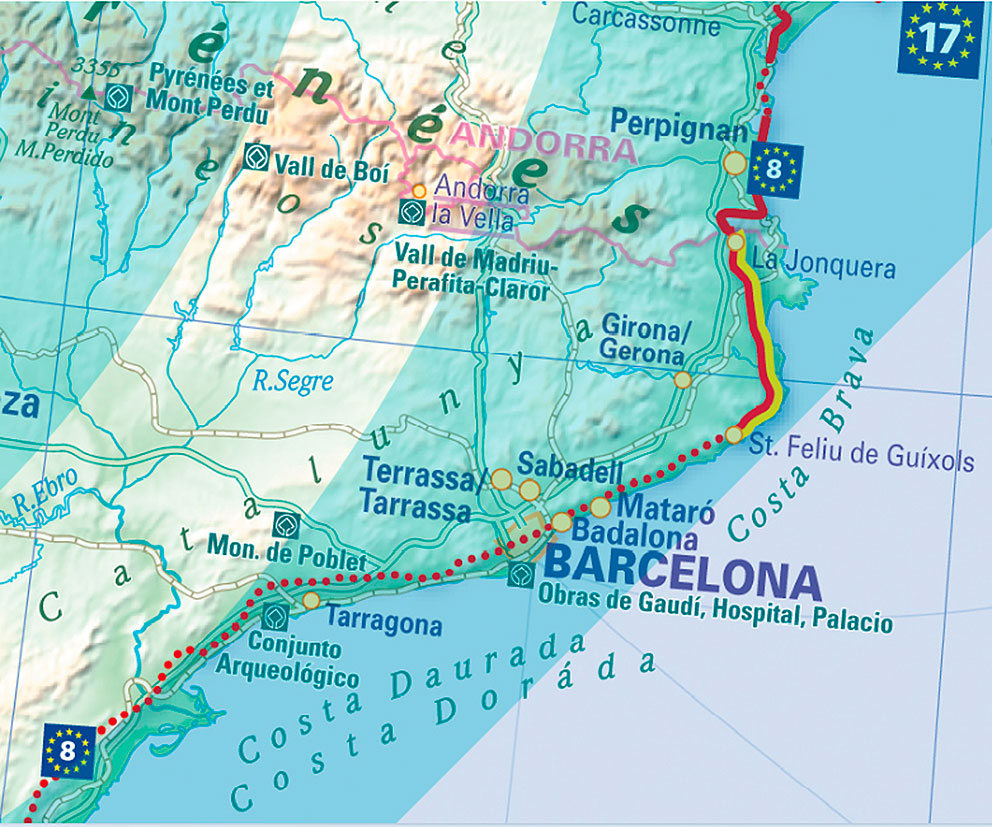 En el seu pas per Catalunya, la ruta Eurovelo 8 encara no té el seu traçat definitiu, i entre l’Empordà i Barcelona hi ha dos possibles traçats en estudi, un dels quals podria passar pel Vallès Oriental, fet que suposaria una gran oportunitat per al desenvolupament del cicloturisme a la comarca, que motivaria el desenvolupament d’infraestructures i serveis relacionats, i l’articulació d’una xarxa de connexions pedalables entre municipis.